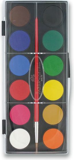 kvalitní vodové barvy v plastovém pouzdře vysoké krycí schopnosti zářivé a syté barvy plastový obal lze využít jako paletu součástí je i štěteček Tip: K vodovým barvám můžete potřebovat i papír, štětce nebo kelímky na vodu 12 barev, ø 24 mm